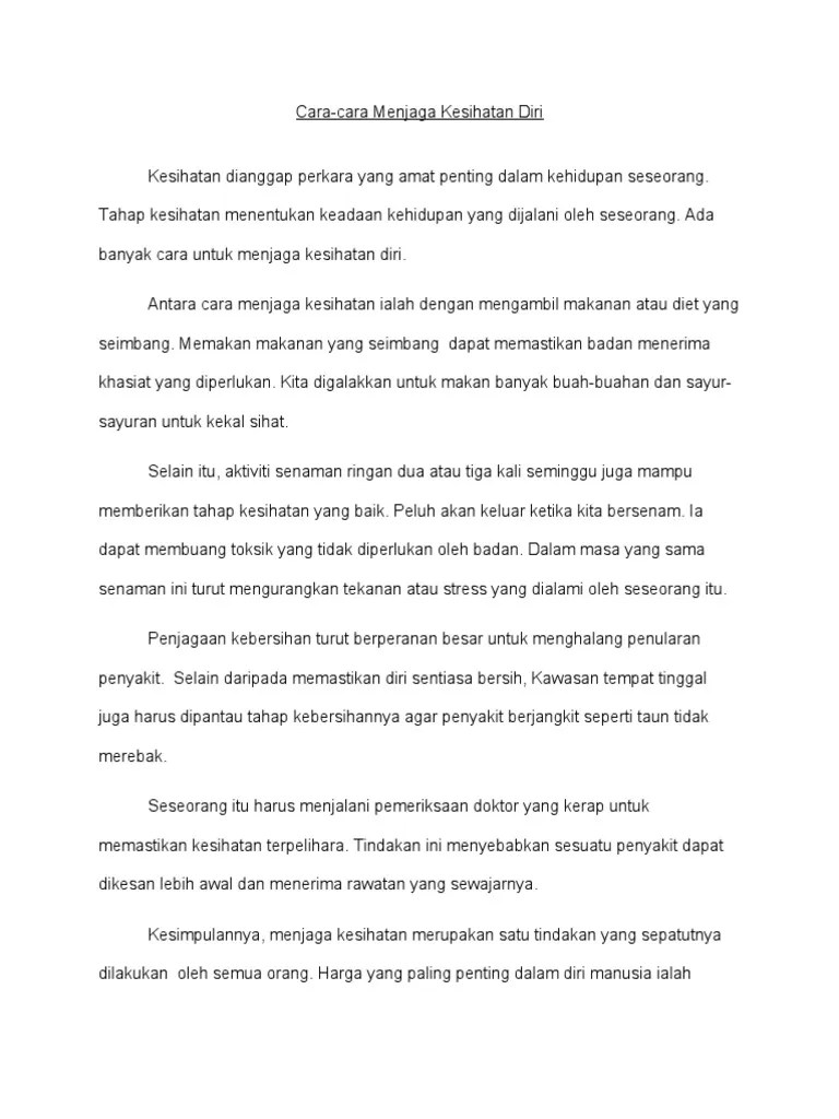 Terdapat pelbagai cara untuk menjaga kesihatan diri. Dengan memiliki tubuh badan yang . Sebagai rujukan untuk semua, berikut dikongsikan contoh karangan . Maafkan saya karangan ini terlalu pendek untuk dibaca sebagai murid.
