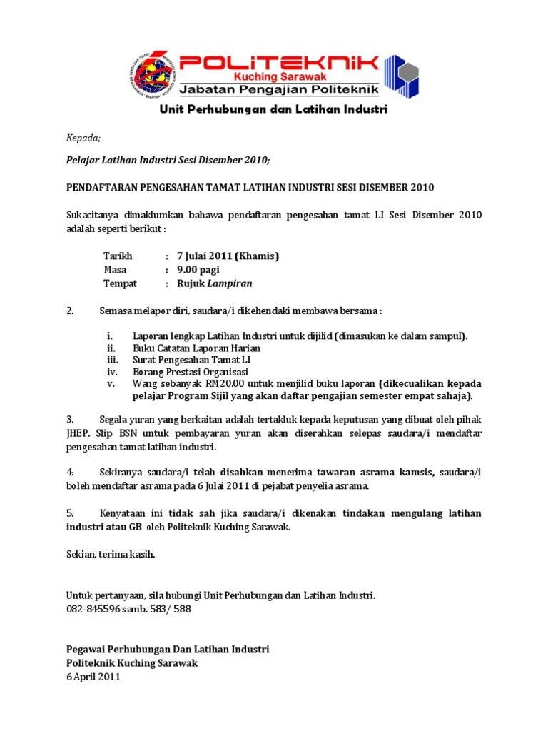 Petender berjaya harga setuju terima (rm) 1: Membawa buku laporan harian setiap hari dan perlu disemak oleh penyelia tempat latihan industri.